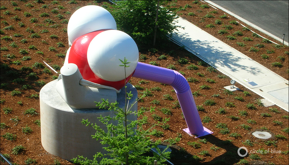 At the end of Brightwater’s entry road visitors see a representation of a water molecule, designed by Buster Simpson. The molecule is also the starting point for Simpson’s “purple pipe” sculpture.