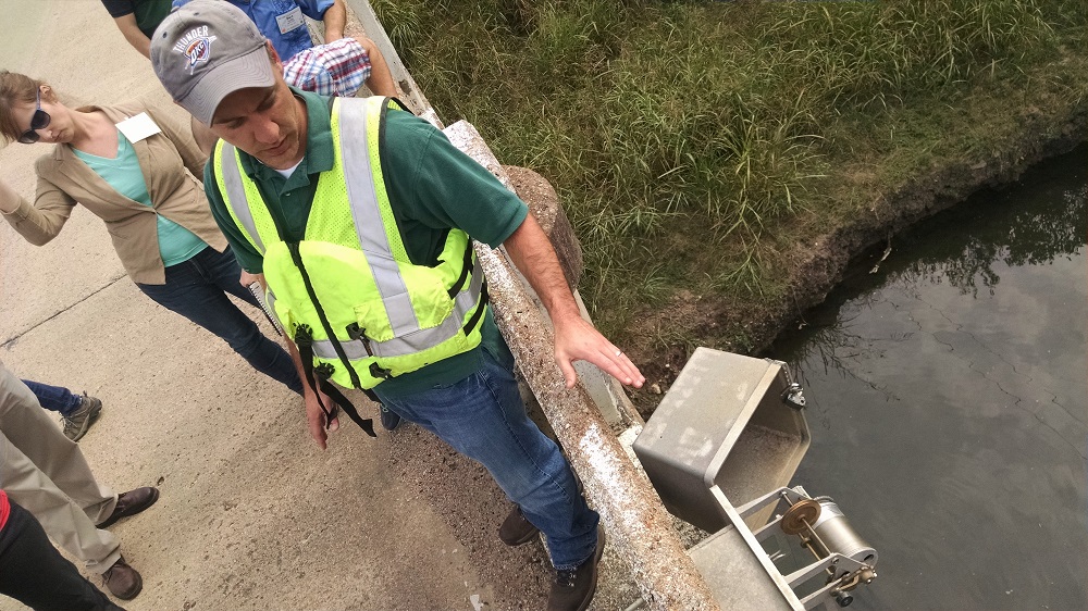 During a field tour organized as part of the Society of Environmental Journalists annual conference, Jason Lewis, a hydrologist at the U.S. Geological Survey, explains how stream gauges are used to measure river flow. The conference took place October 7-11, in Norman, Oklahoma.