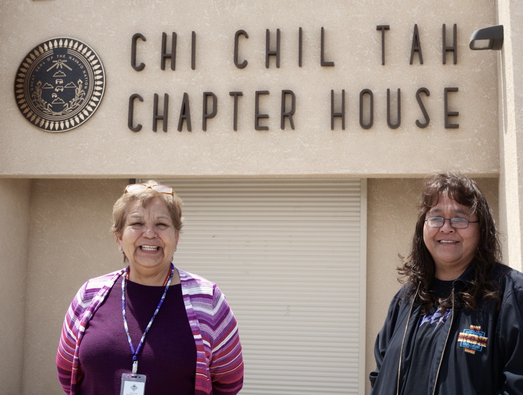 Roselyn John, left, community services coordinator, and Melita Martinez, accountant, describe a planned water system that will connect homes in Chi Chil Tah, a Navajo chapter, to a community well. The community was hard hit by the COVID-19 pandemic, and John said a lack of water was one of the reasons. Photo: Marjorie Childress